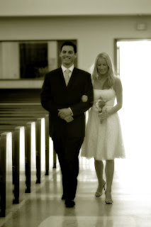 Him- handsome, confident, beaming, like he always is. Me- trying to hold back my tears so I would still be a pretty bride. I love that we walked down the aisle together, both ways. How untraditional, huh? He also tied the bow on my dress when I was getting ready. I carried a thrown-together bouquet of flowers from Safeway with my Grandma Katie's rosary. To be honest, I think I tried to play off the 25th like it wasn't that big of a deal- figuring I'd be more excited, nervous, anxious, etc. on the 27th when everyone would be there. I was wrong. I remember thinking I'd keep my cool, but the second we started walking together and I heard the music, I lost it. I made eye contact with Stace, and, with tears in her eyes, she wagged her finger at me to stop crying. At the front of the aisle, I felt at peace. Father Jim made us (I mean MADE us) memorize our vows. "But can we take a cheat sheet in case we get nervous," we asked a few days prior. "Nope," he replied. But we both did it. And didn't screw up. He got a little teary. I got a lot teary. And it was perfect.